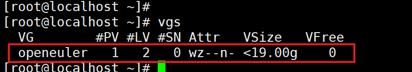 PV /dev/sda2 VG openeuler lvm2 [<19.00 GiB / 0 free]