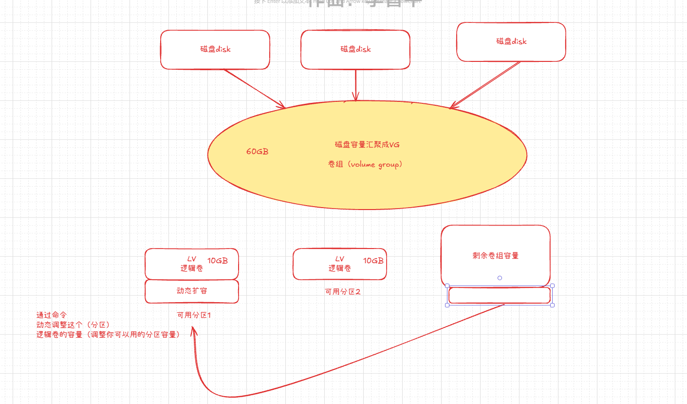 逻辑卷组(500G+100G=600G),大硬盘500G------>获取部分的容量,化为一个逻辑组(分区)---->逻辑组进行格式化(分区进行格式化)-------->挂载使用