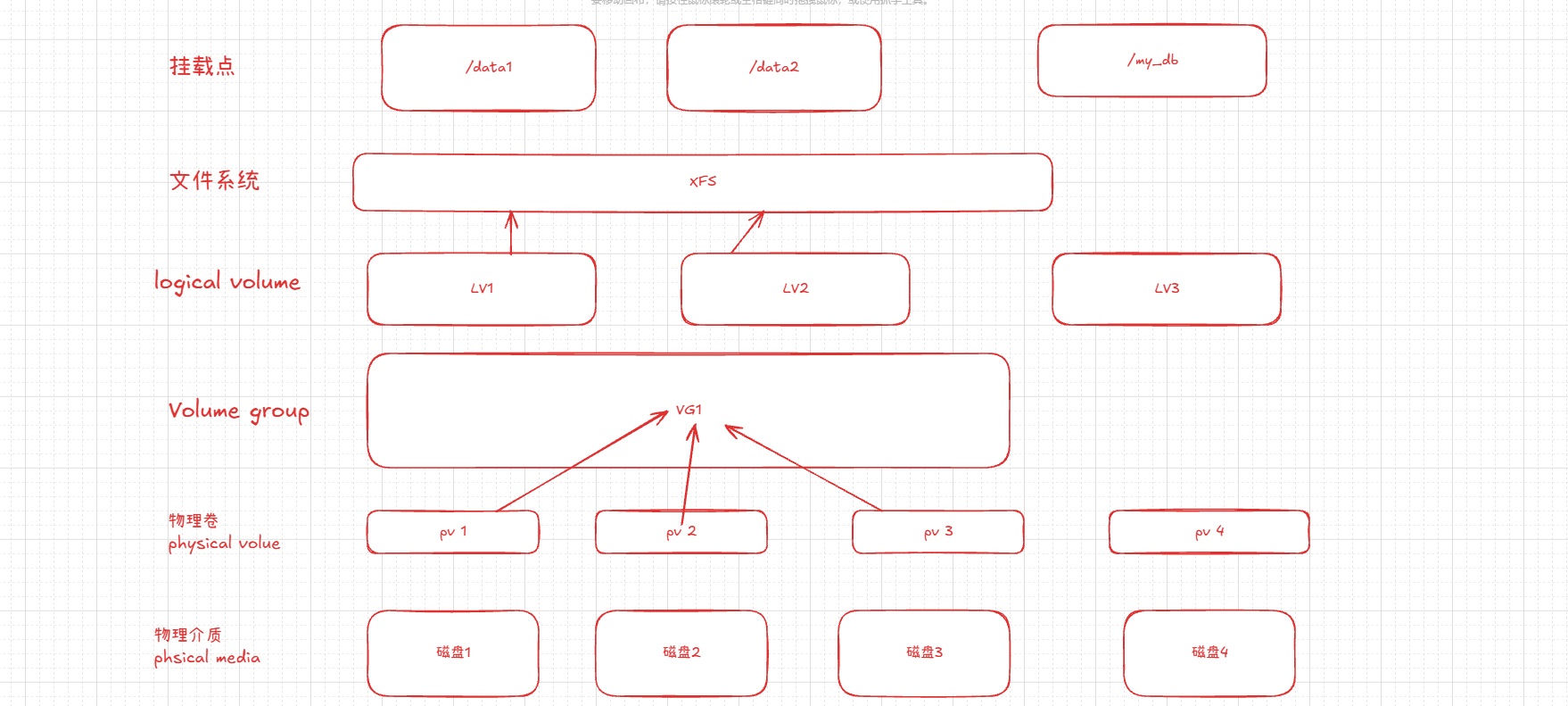 这里的物理层也叫pe ,我们需要将物理卷pe整合在pv中,然后我将我整合的逻辑上的pv整合成一个大的VG组,然后对VG组进行分区得到多个LV(LV中包含多个LE(逻辑单元))