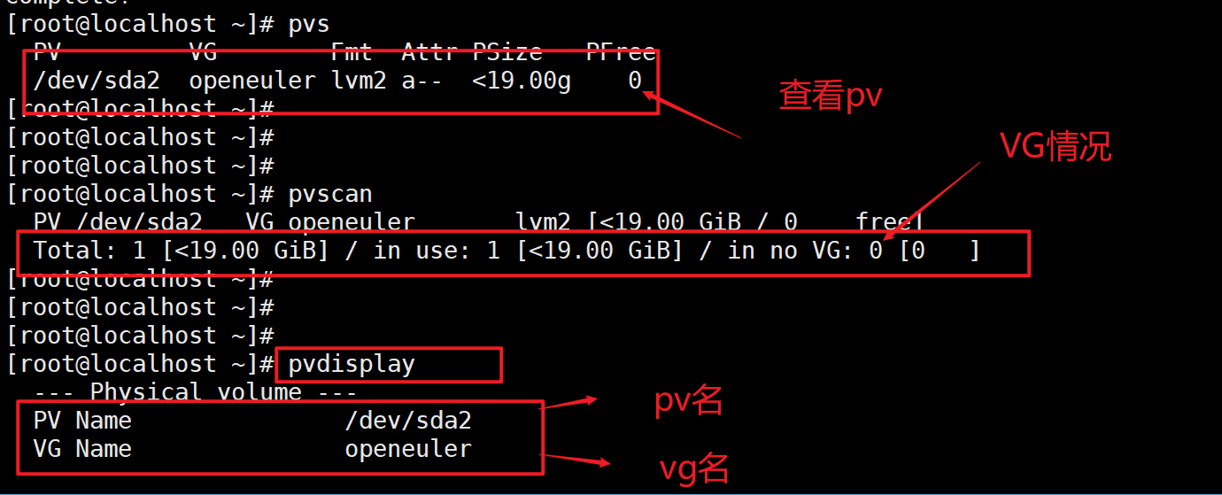 /dev/sda2 openeuler lvm2 a-- <19.00g 0