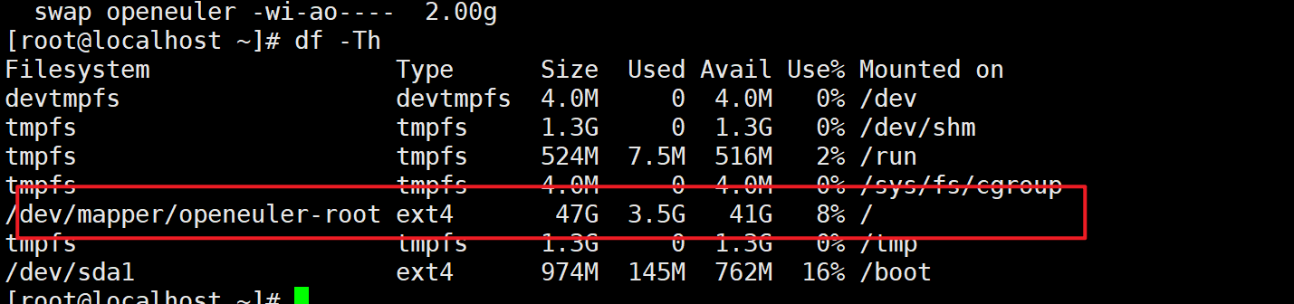 /dev/mapper/openeuler-root 47G 3.5G 41G 8% /