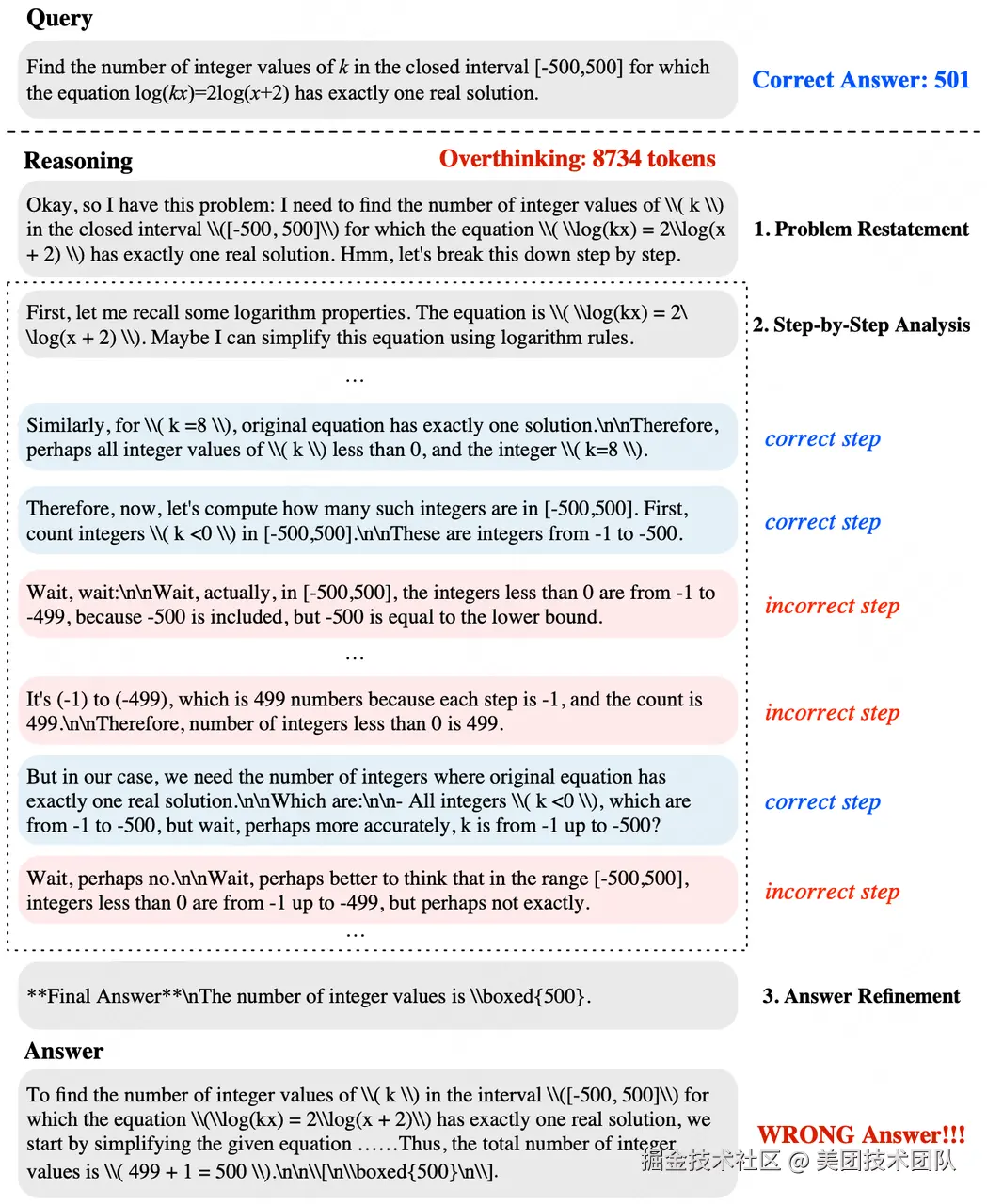 如图所示,在这个例子中,模型为解决一个非常简单的子问题([-500,0] 中有多少个小于 0 的整数)进行了反复的思考,在正确和错误之间反复横跳,最终得出了一个不正确的中间结论,进而导致了最终结论的错误。这些无效步骤不但不能指引推理路径的发展,反而会导致中间过程出错。