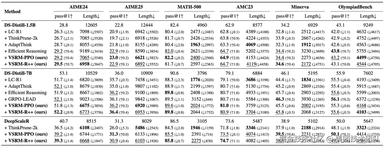 通过在数学任务上的实验显示,在多个常用 Benchmark 上,VSRM 加持的后训练使得不同尺度的模型实现了输出长度的大幅缩减,甚至在部分情况下提升了模型表现。