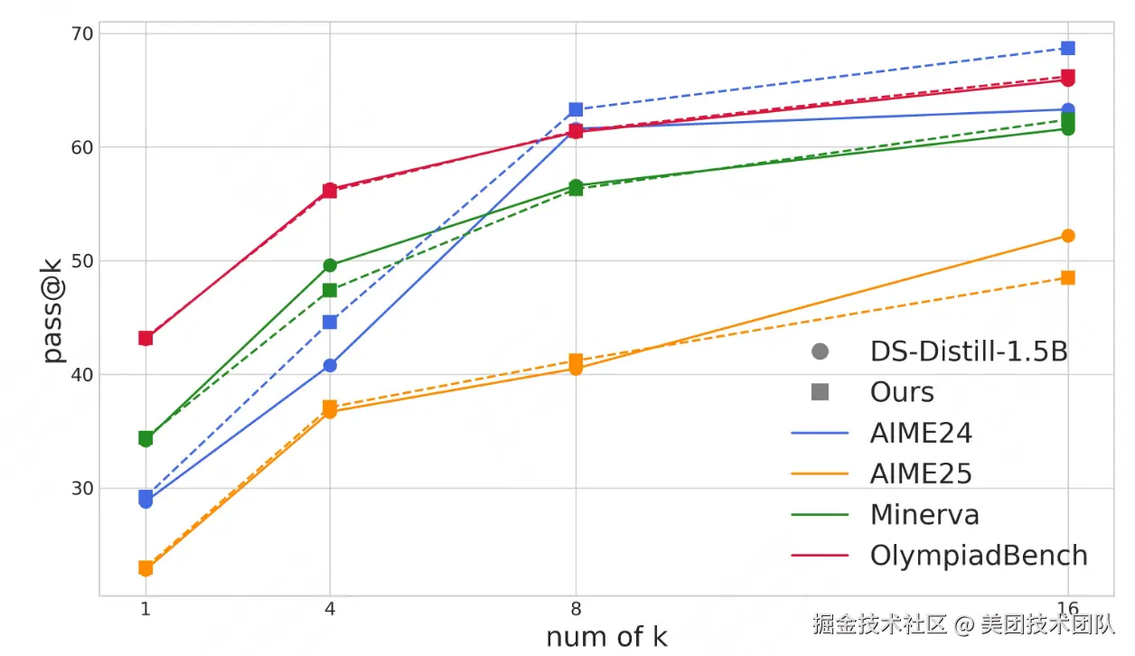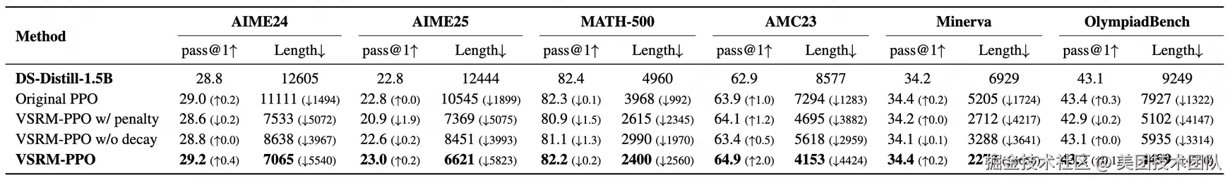 在困难 Benchmark 上,随着 k 的增加,Pass@k 指标的提升趋势能够反馈模型探索更多可行解的能力。可以看到 VSRM-PPO 训练后的模型,体现了与原本模型一致的趋势,说明模型并没有因为输出长度的压缩而失去了最重要的探索能力。