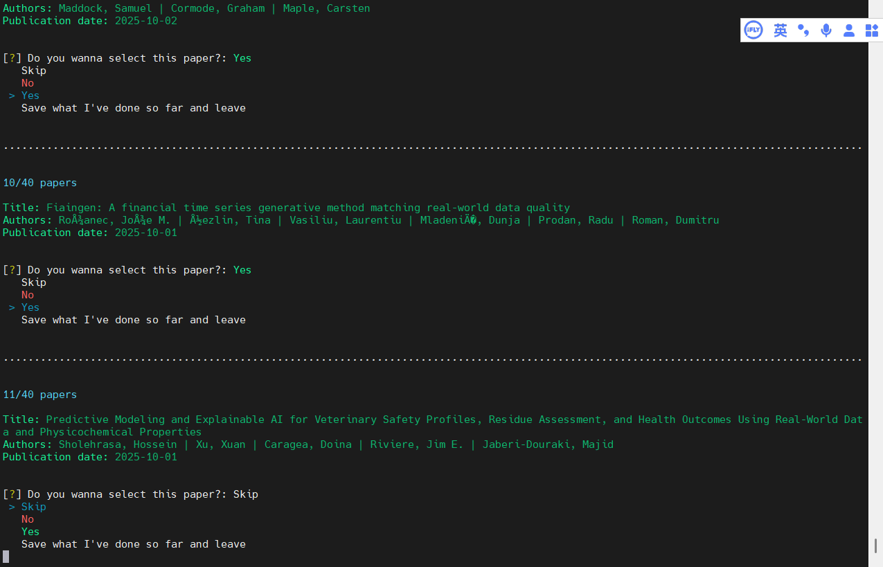 该命令通过 findpapers工具从"arxiv,ssrn,repec,econbiz,semanticscholar"数据库中检索符合如下指定关键词组合
