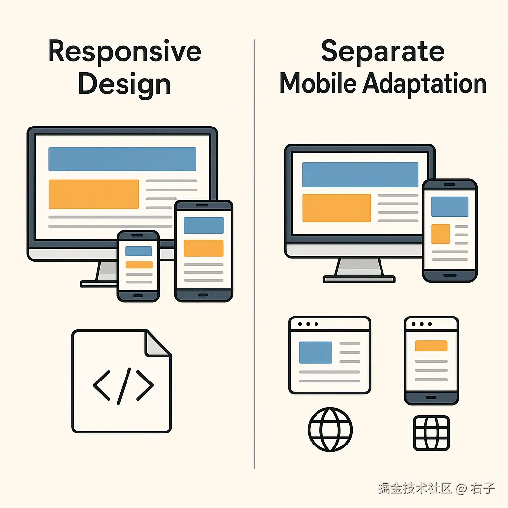 路径提供独立的移动站点。这类网站通常有独立的开发与维护流程,页面结构、内容数量和交互方式都专门优化为移动体验。Ramotion 的一篇分析指出,移动站点通常有独立的 URL、为小屏幕优化的布局、轻量的资源以及单独的开发与维护,它们在手机上加载快、操作友好,但在桌面上可能无法完整发挥功能,而且 SEO 要处理分离的域名和重复内容。
