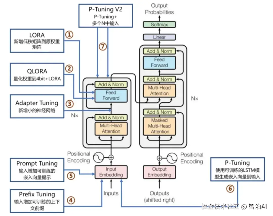 以下图表示了7种主流微调方法在Transformer网络架构中的作用位置及其简要说明,接下来将详细介绍每一种方法。