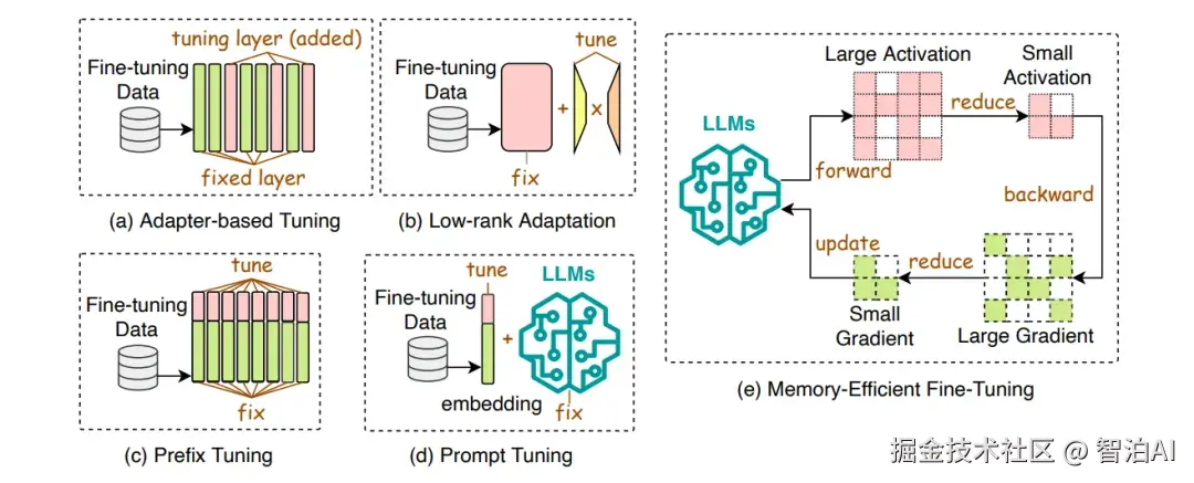 PEFT包括LORA、QLORA、适配器调整(Adapter Tuning)、前缀调整(Prefix Tuning)、提示调整(Prompt Tuning)、P-Tuning及P-Tuning v2等多种方法。