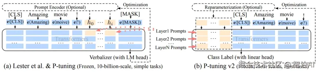 P-Tuning v2是P-Tuning的进一步改进版,在P-Tuning中,连续提示被插入到输入序列的嵌入层中,除了语言模型的输入层,其他层的提示嵌入都来自于上一层。