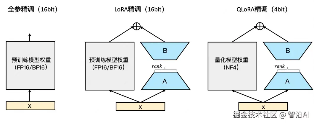 LoRA: 在模型的权重矩阵中引入低秩矩阵来实现微调。这些低秩矩阵作为原有权重矩阵的修改项,在实际计算时对原有权重矩阵进行调整。