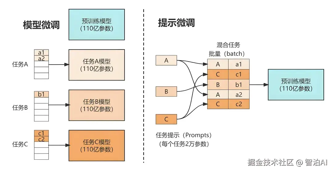 这种方法的优势在于不需要调整模型的所有权重,而是通过在输入中添加前缀来调整模型的行为,从而节省大量的计算资源。