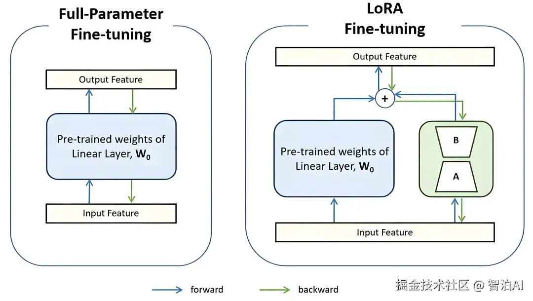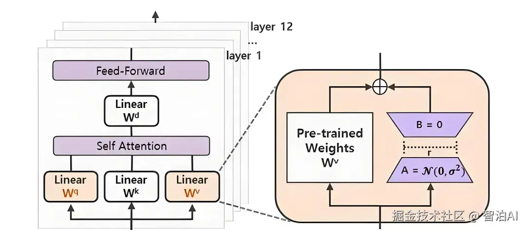 采用LoRA方法,我们无需直接修改模型现有的大量权重。相反,只需在模型的关键部位引入低秩矩阵,并通过这些矩阵的乘积来进行有效的权重调整。