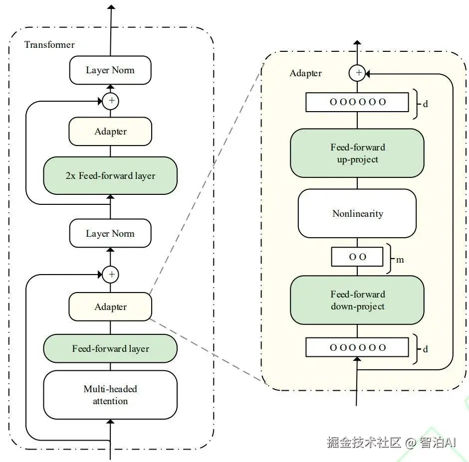 与LORA技术类似,适配器调整的目标是在保留预训练模型原始参数不变的前提下,使模型能够适应新的任务。