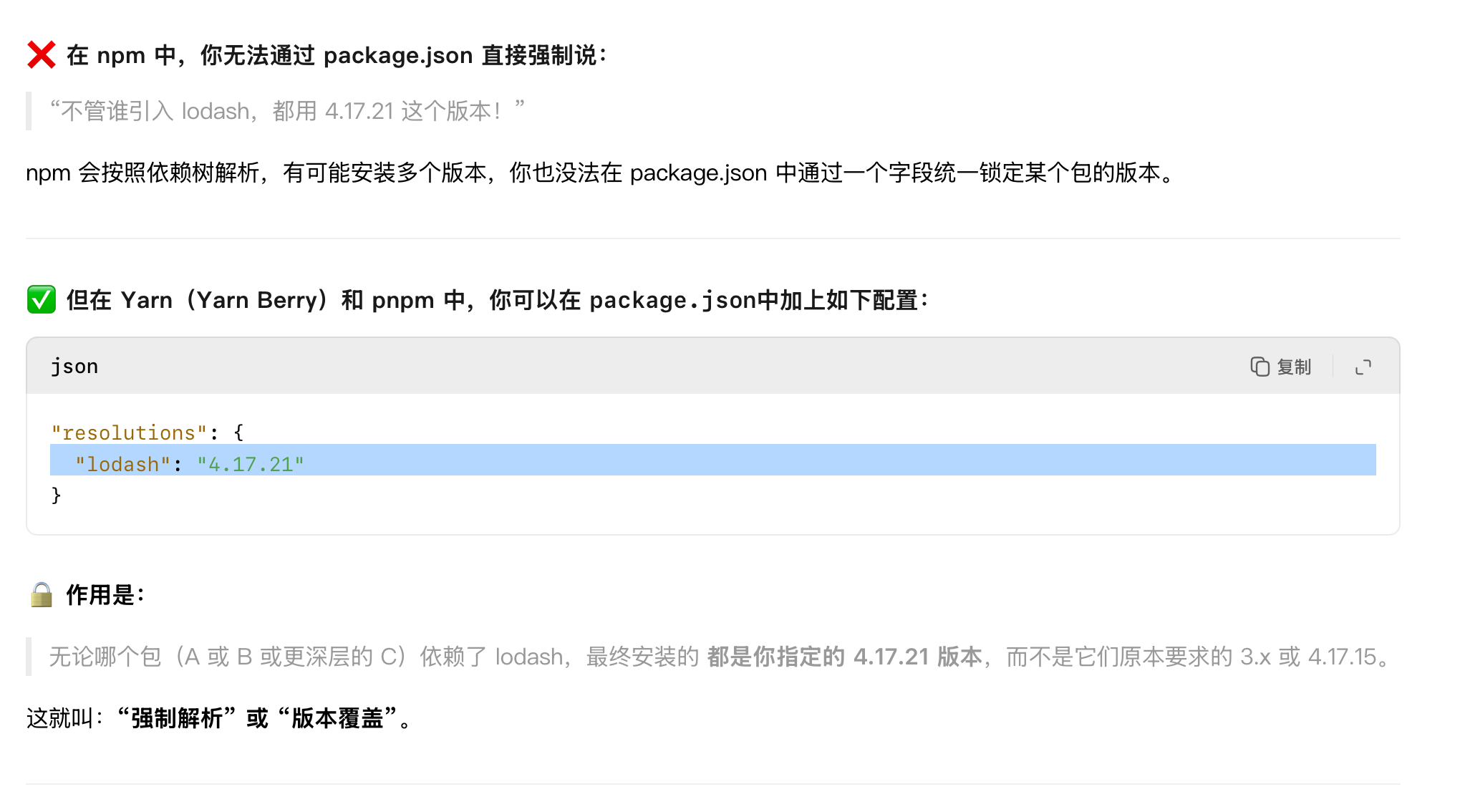 ⚠️ npm 原生不支持 resolutions 字段 ,但 Yarn 和 pnpm 支持!