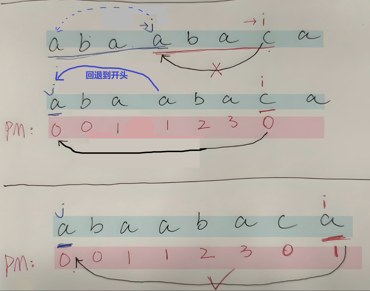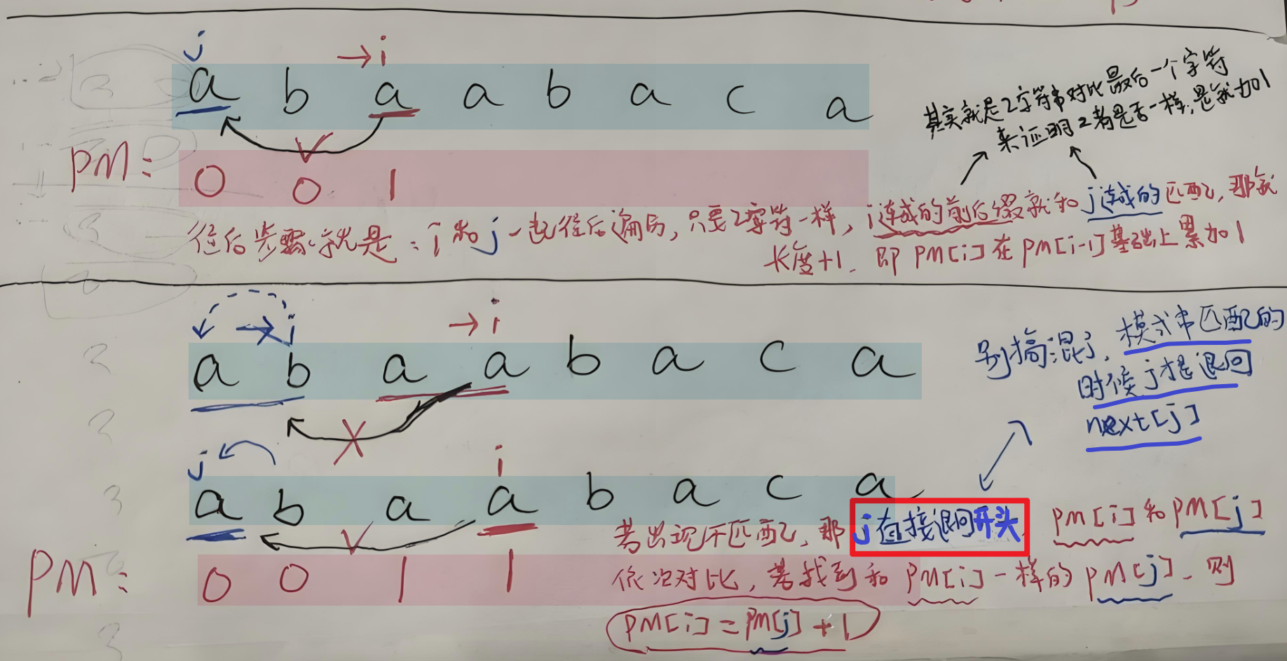 - 【如果 PM[i] != PM[j]】:那么**【i 不要动!!】**,【指针 j 一步步往回遍历】