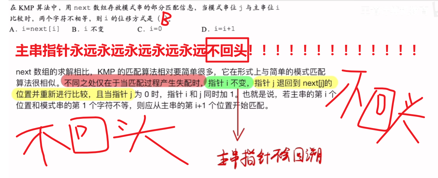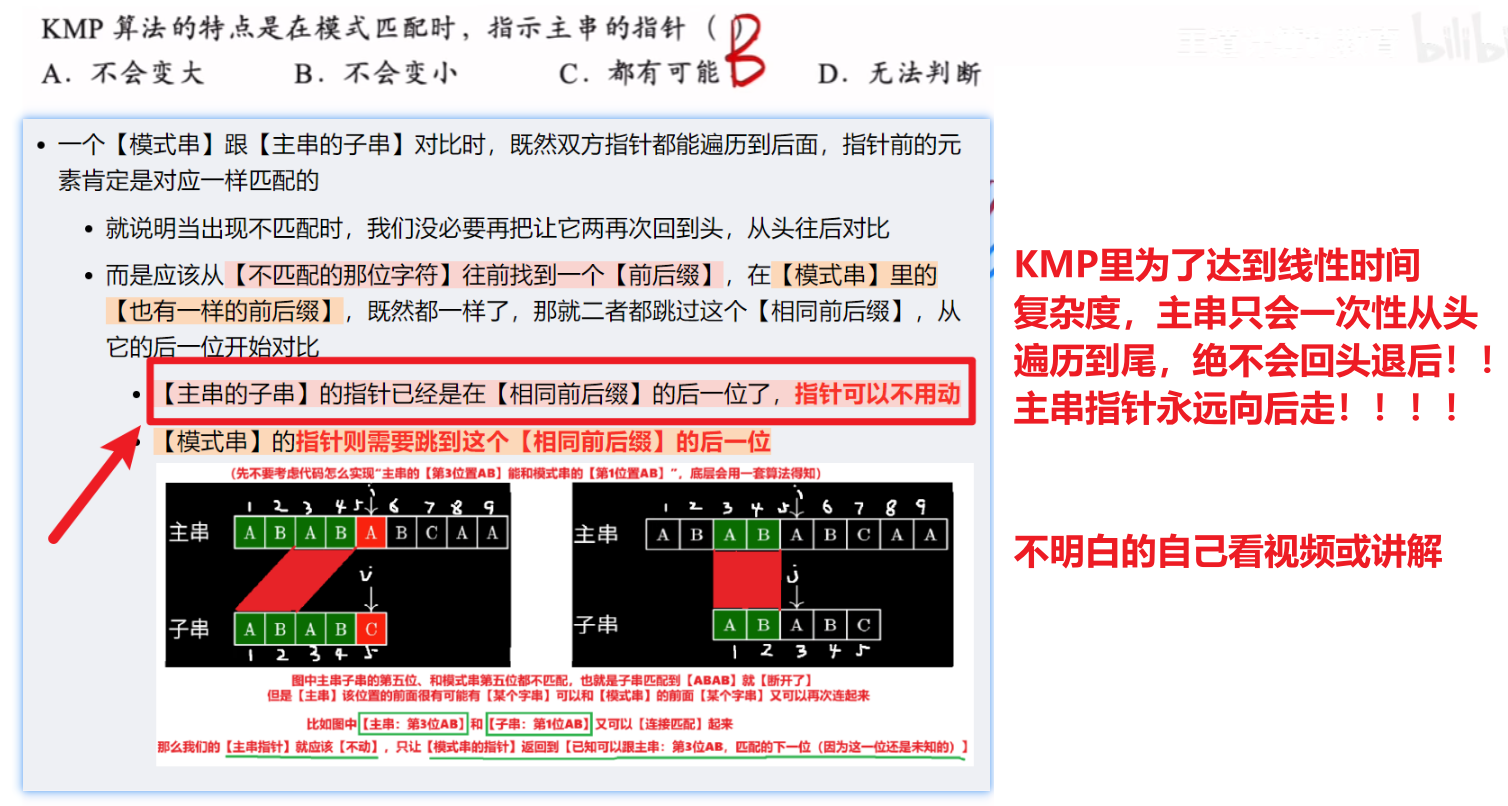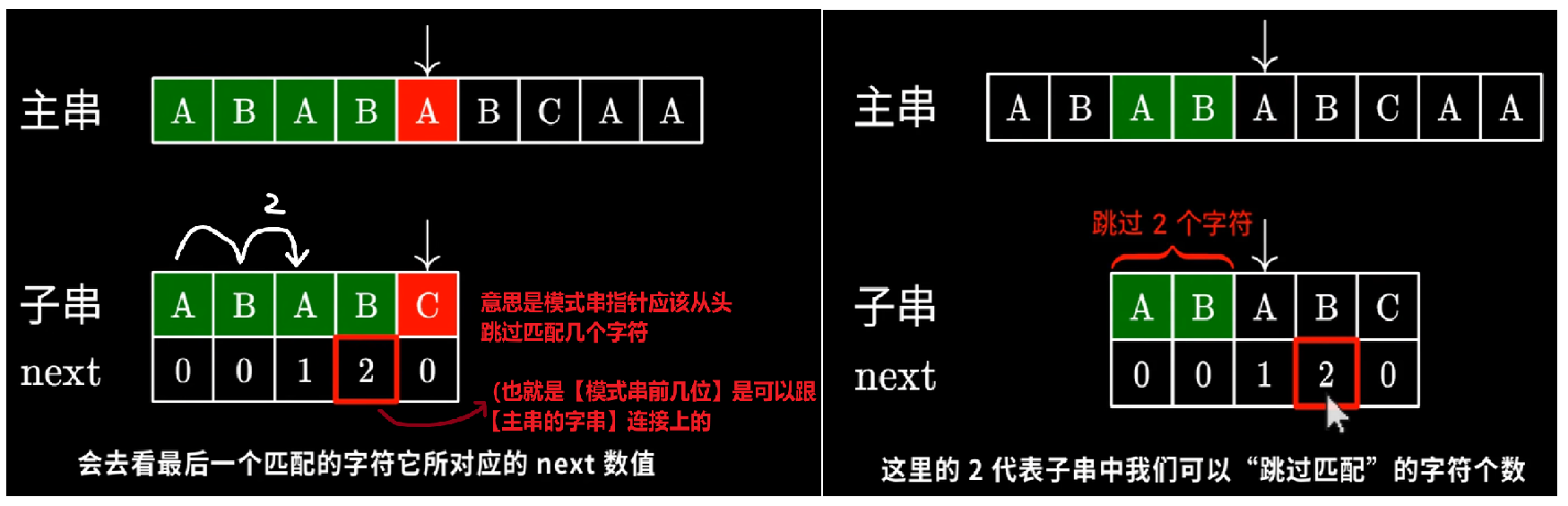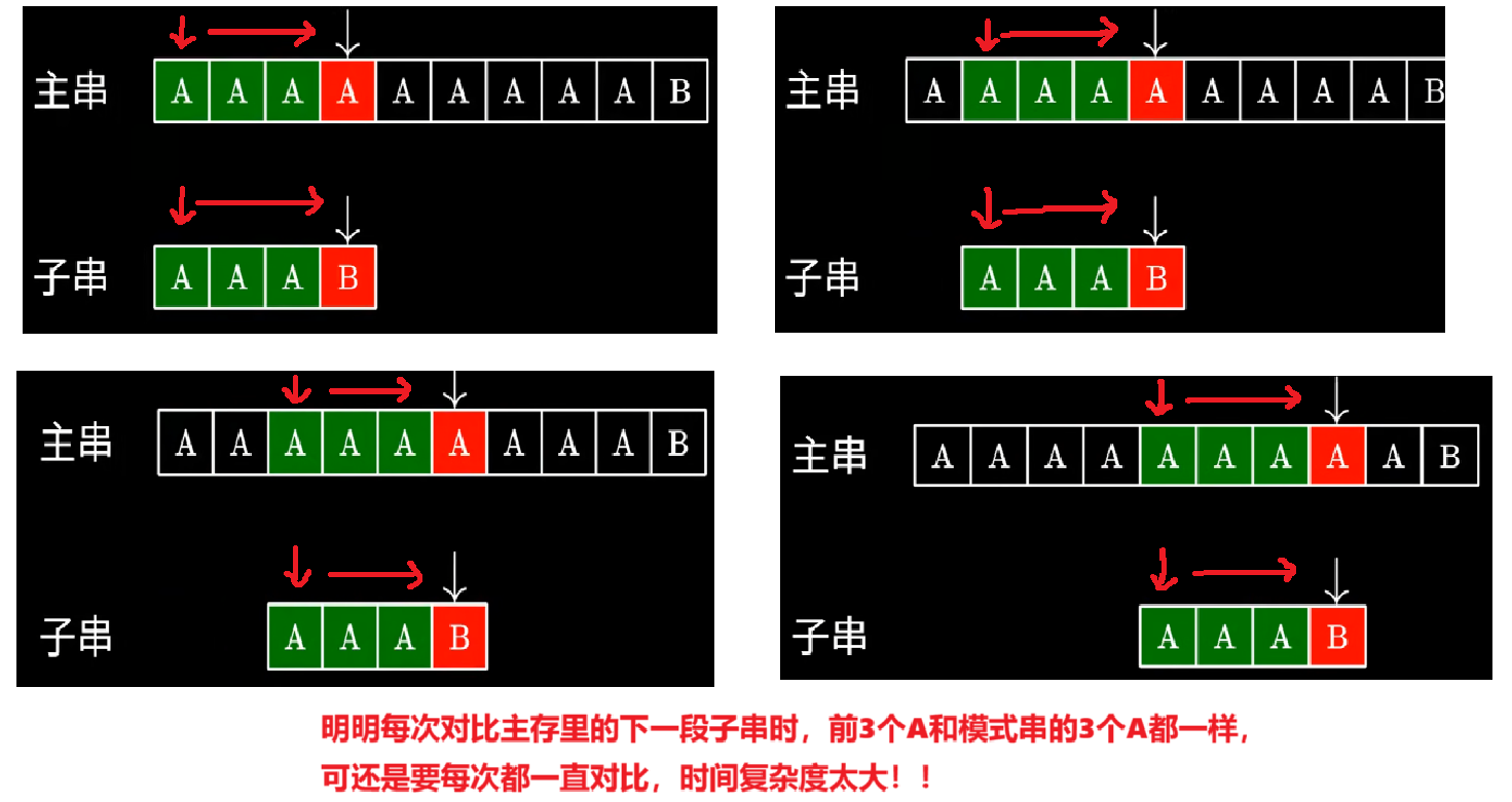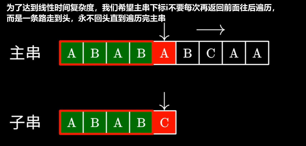 - 【主串的子串】的指针已经是在【相同前后缀】的后一位了,指针可以不用动