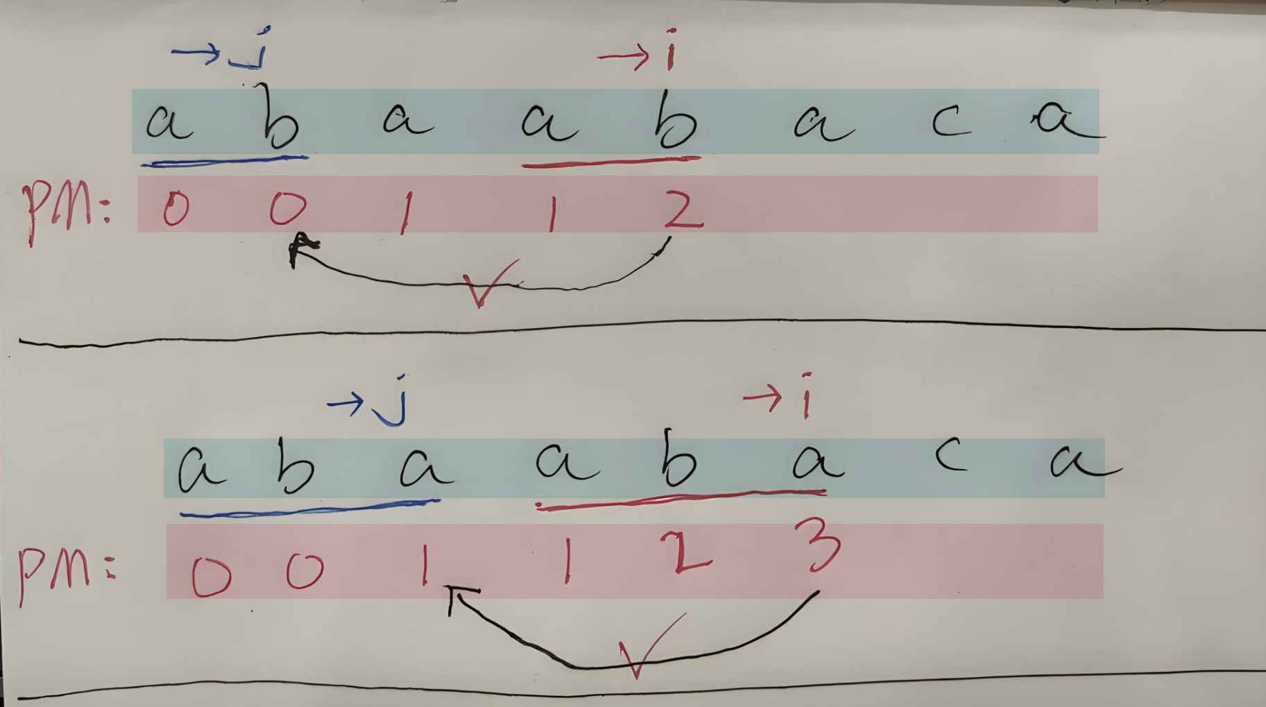 - 【如果 PM[i] == PM[j]】:那么i连起来的字符串和j连起来的字符串一直一样,那就【PM[i] = PM[i-1]+1,统计相同最长前后缀长度】就行,也就是一直累加