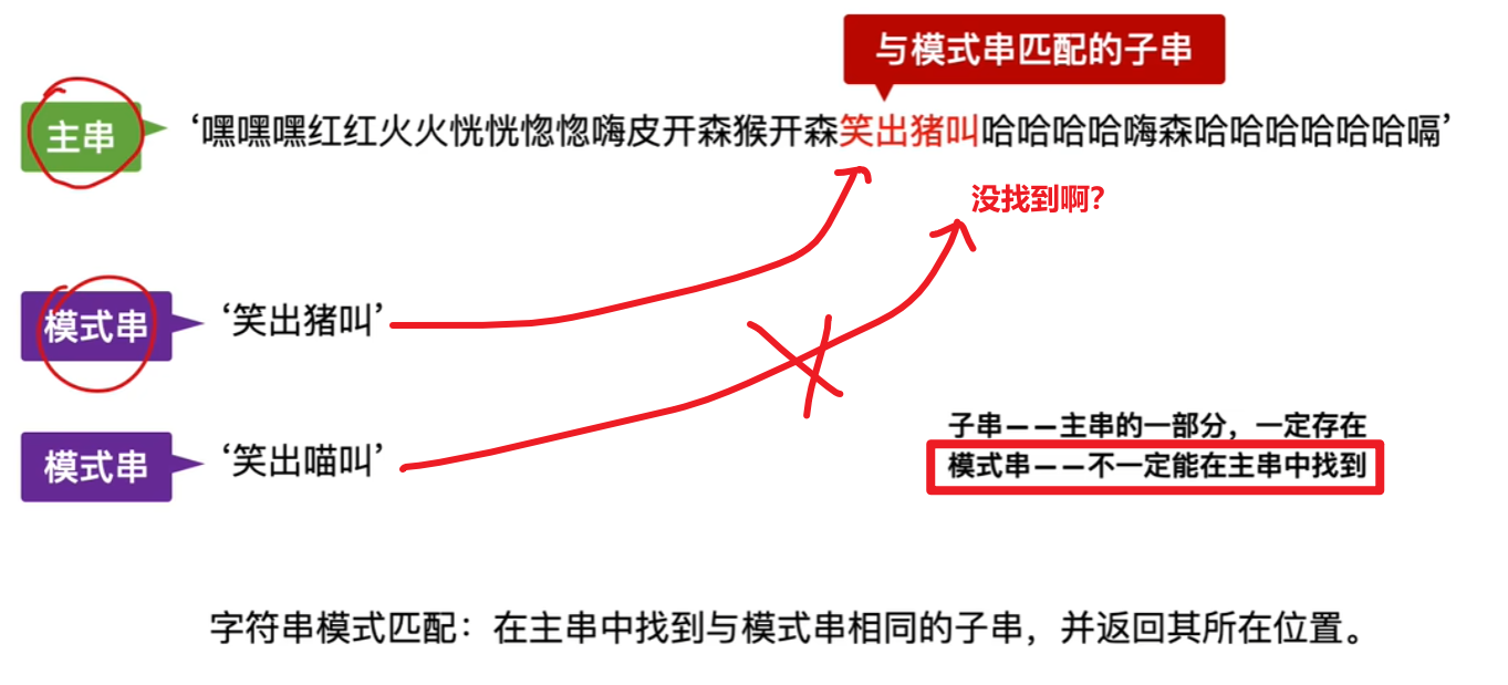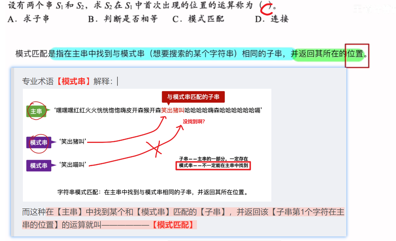 而这种在【主串】中找到某个和【模式串】匹配的【子串】,并返回该【子串第1个字符在主串的位置】的运算就叫------------------【模式匹配】