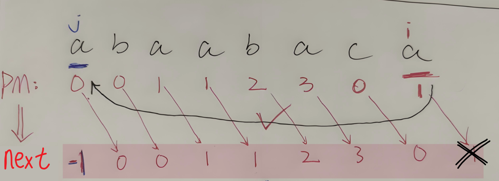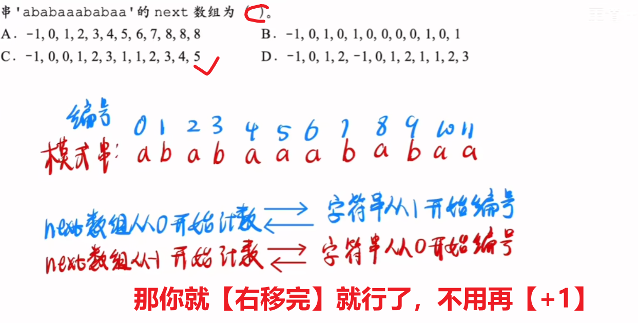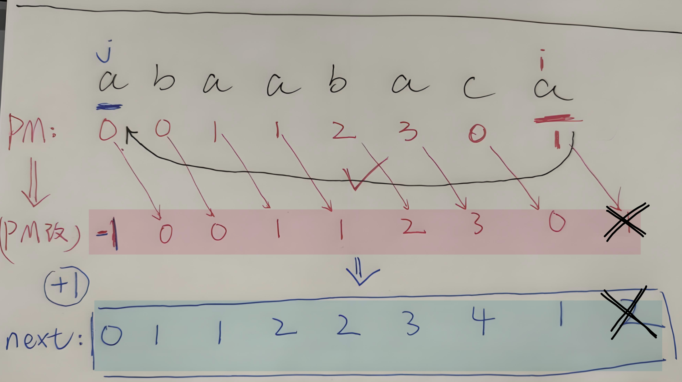 - 【另外】上面是字符串以【1为开头】的情况,如果是以【0为开头】的话,那PM转化成【next数组】时只需要【右移 + 开头补上-1】到这一步就够了!!!