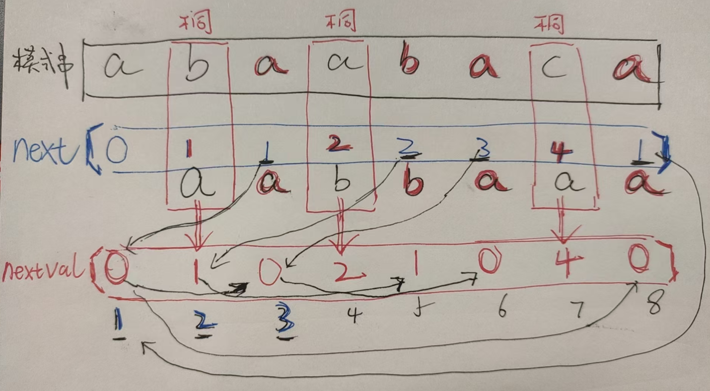 - 然后【新字符串】里剩下【和模式串一样的字符位】,我们根据上面【 next[i] 】找到【 nextval[ next[i] ] 】,就是【next[i]的值】