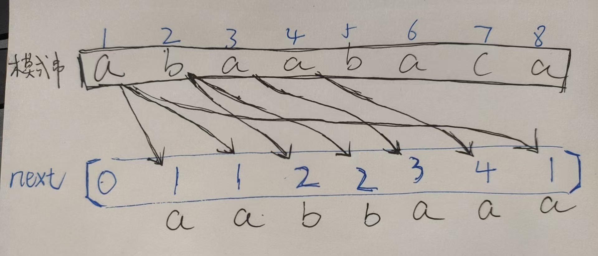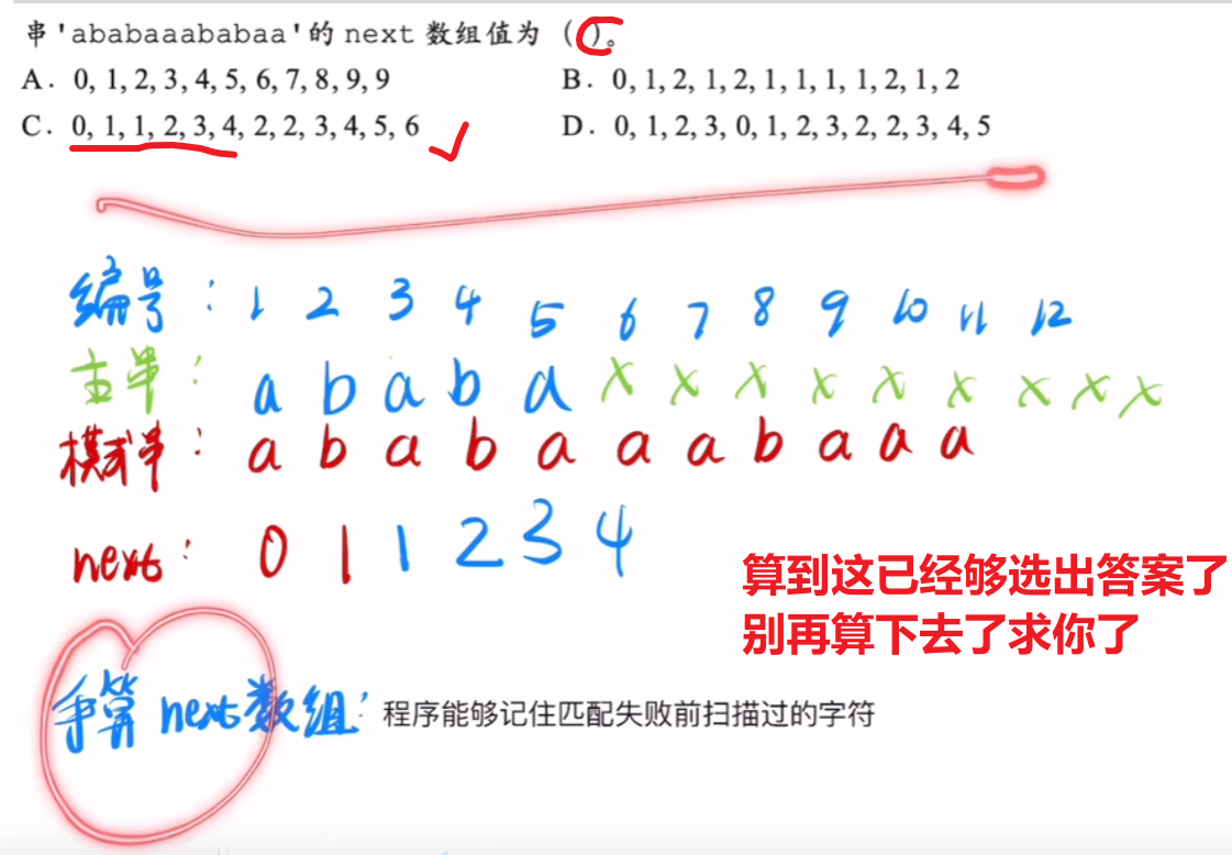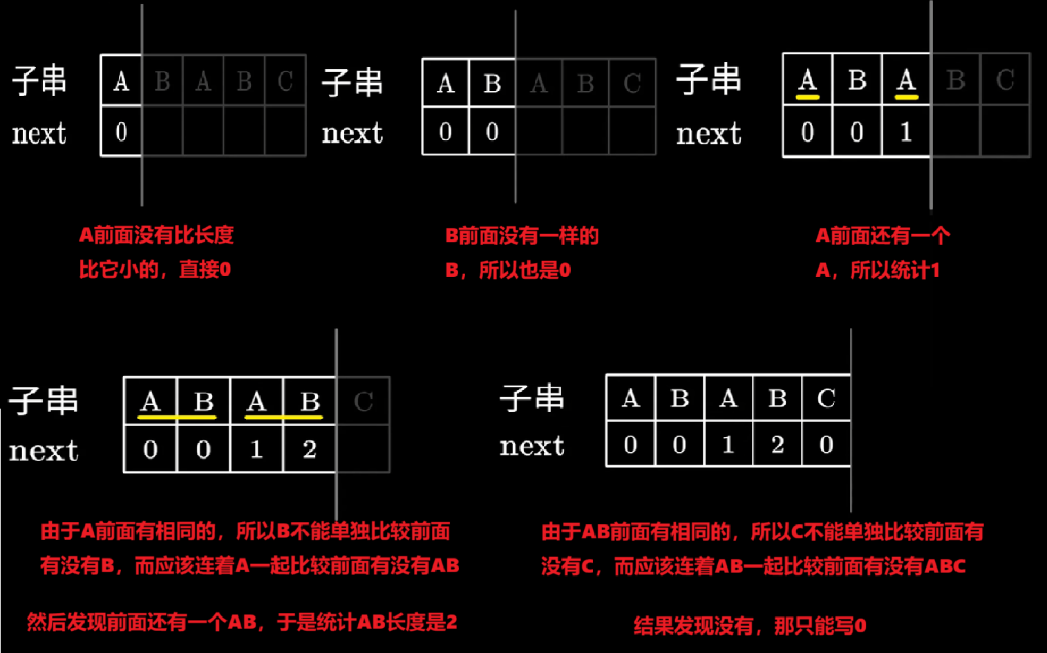 ① 多加一个【next数组】用来统计模式串【每一位出现不匹配】时,对应的【指针应该跳到哪?】