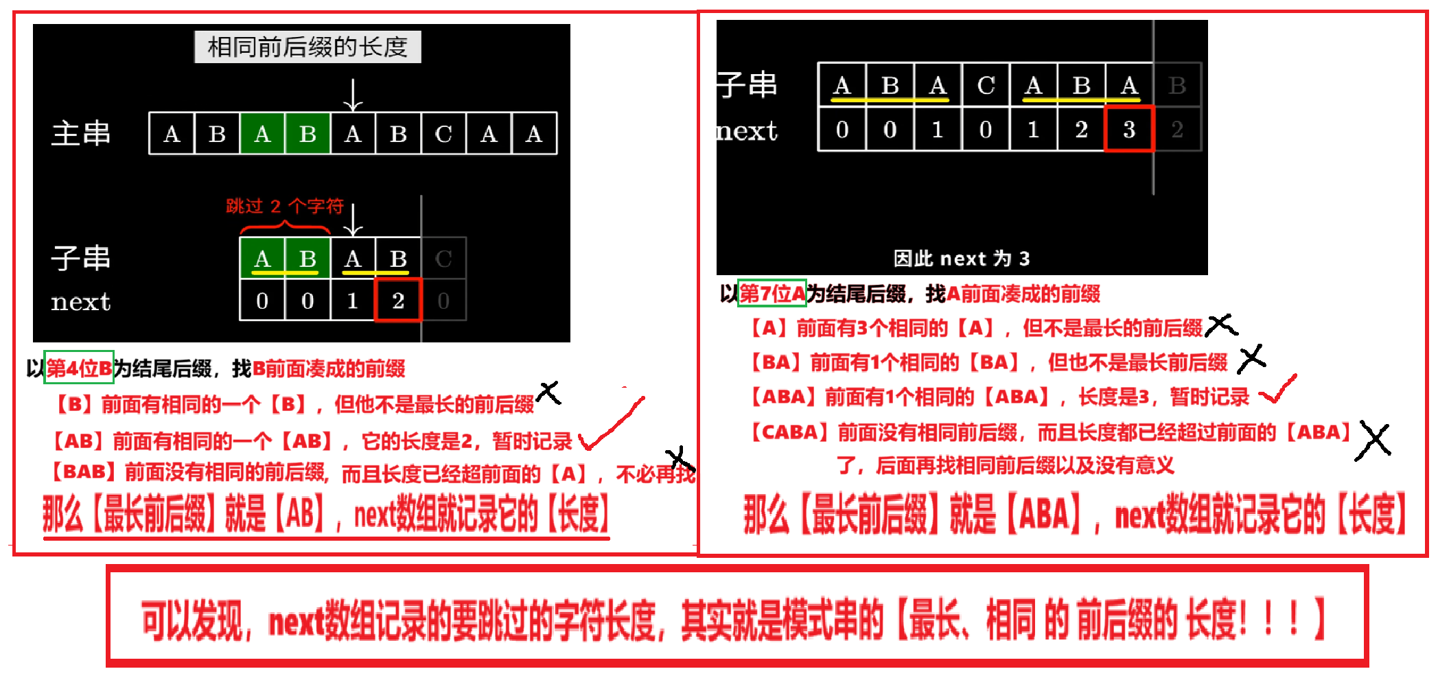 ② 而【next数组】的本质就是:记录模式串里,每一位【作为后缀、最长、有相同的前后缀的长度】