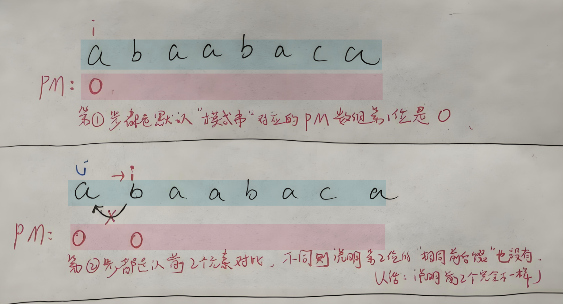 - 2、【PM数组】对应统计【模式串的每一位】前面的【最长相同前后缀】的【长度】
