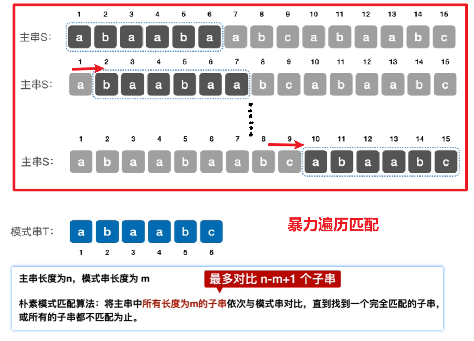 没什么好说的,写过代码的应该看得懂下面图,就是【主串】取【和模式串一样长的子串】一一对比,一旦不同,【主串的子串】整体往后挪一位,又从头开始一一对比