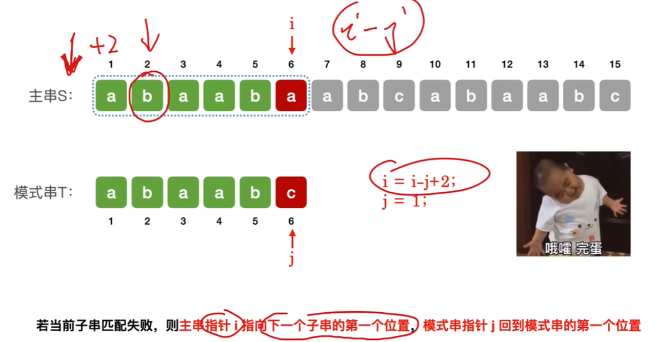 - 【i-j+2】就是回到主串的【当前子串】 的开头前二位,那么就可以以他为【下一个子串的开头第一个元素】