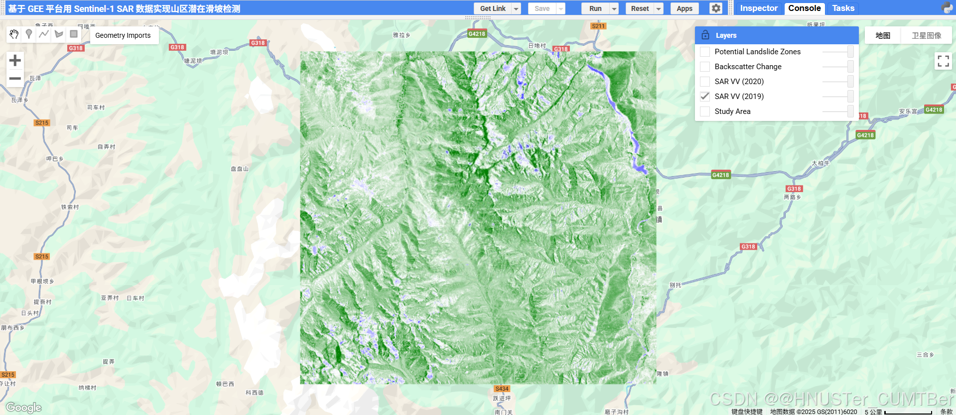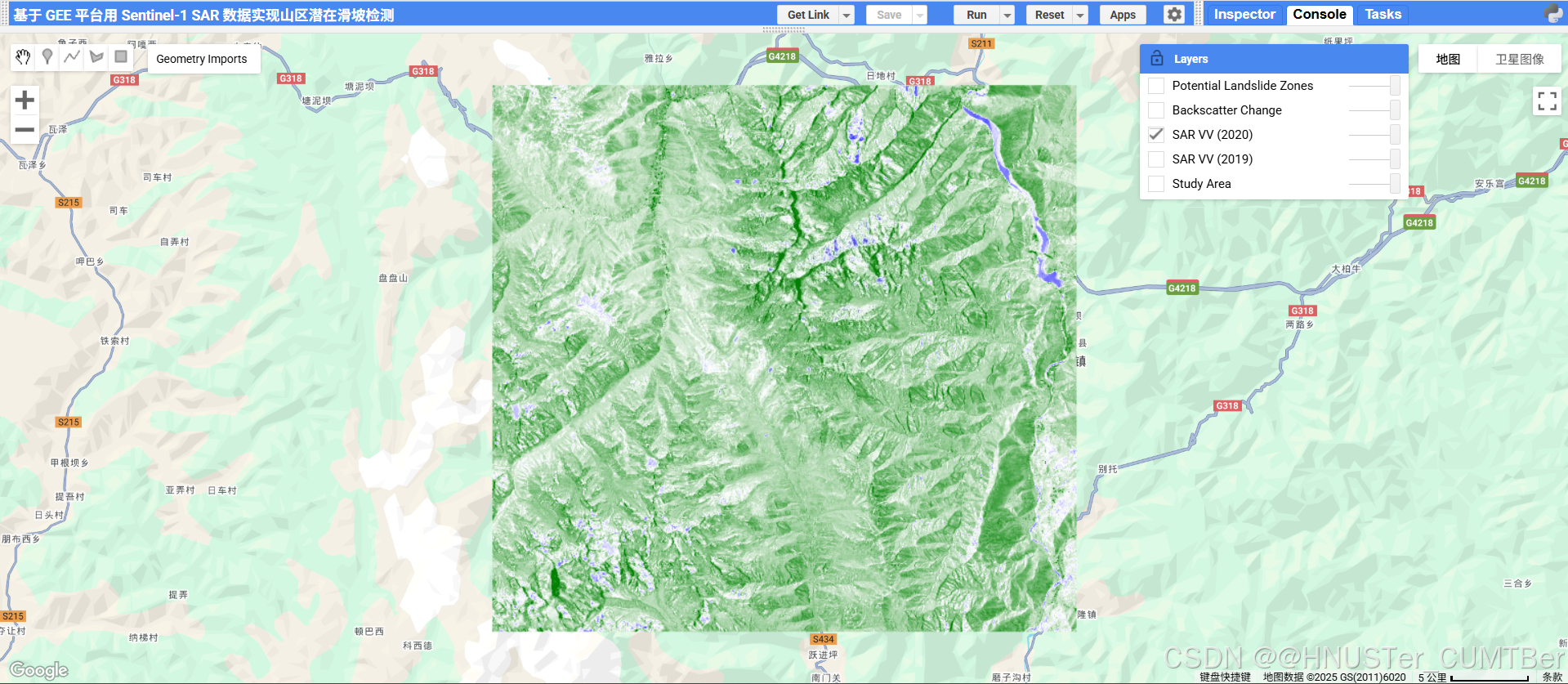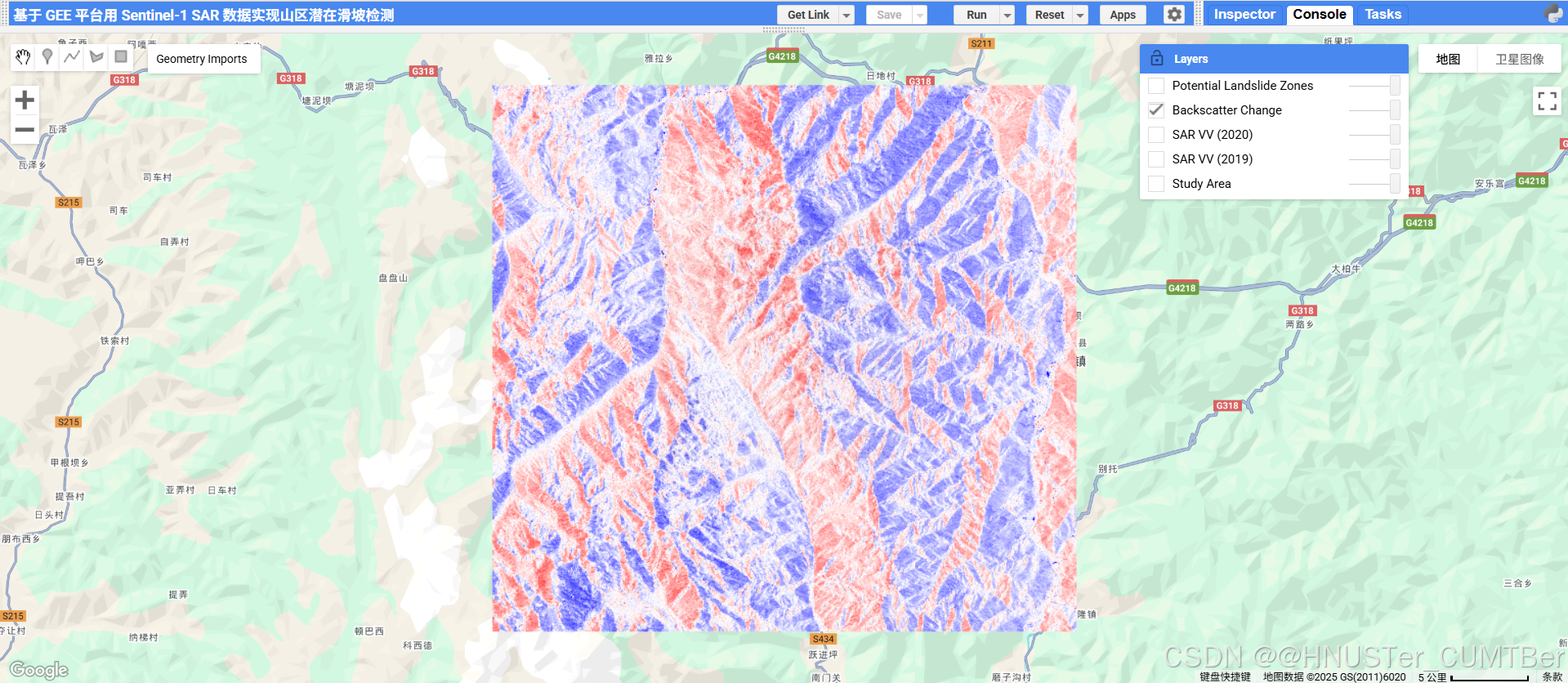 - 统计面积并可视化,导出结果:对提取出的潜在滑坡区域进行面积统计,将面积单位转换为平方千米(km²),以便更直观地了解滑坡的规模大小。同时,在 GEE 平台的地图界面上对研究区影像、后向散射变化图、潜在滑坡区域等进行可视化展示,让检测结果更加清晰易懂。最后,将潜在滑坡区域的影像数据导出到 Google Drive 等存储位置,方便后续的进一步分析和应用。