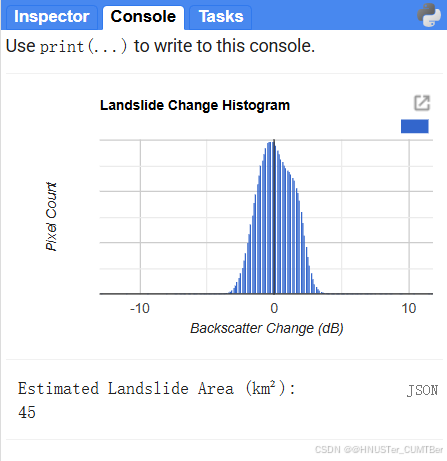代码运行后,在 GEE 平台的控制台会输出 "Estimated Landslide Area (km²):" 以及对应的数值,该数值就是研究区内潜在滑坡区域的总面积。