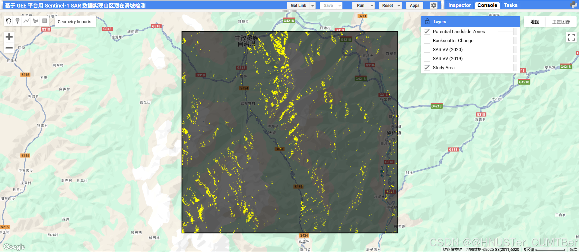 在 GEE 平台的地图界面上,潜在滑坡区域以黄色显示,这些黄色区域就是我们通过数据处理和阈值筛选提取出来的滑坡易发区和已发生滑坡的区域。