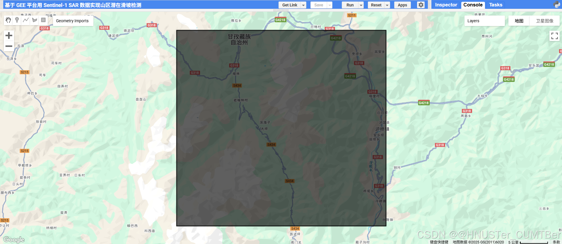 - 导入研究区 AOI:AOI(Area of Interest,感兴趣区域)是我们开展滑坡检测的具体范围。在 GEE 平台中,需要先将研究区的矢量边界数据(如 Shapefile 格式数据)导入,作为后续所有数据处理和分析的空间约束范围。