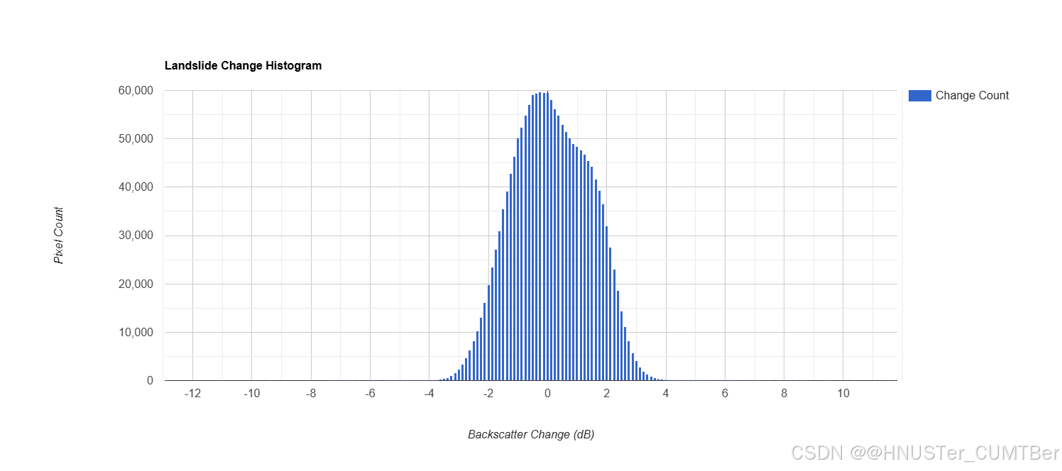 通过代码中绘制的 "滑坡变化直方图",我们可以清晰地看到后向散射变化值的分布规律。直方图的横轴代表后向散射变化值(单位:dB),纵轴代表对应变化值的像素数量。
