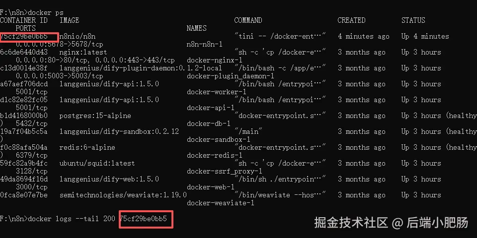 找到n8n容器的id,查看运行日志,命令为docker logs --tail 200 你容器的id