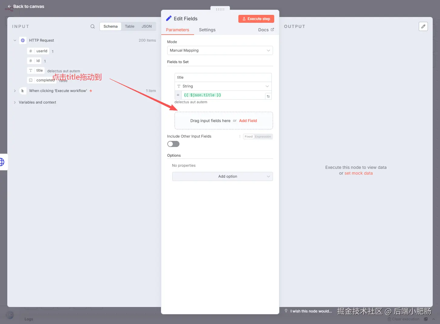 这个节点可以选择我们接口调用返回结果所需要的字段,如我只想要title,只需要把title字段拖动到Edit Fields面板就行。