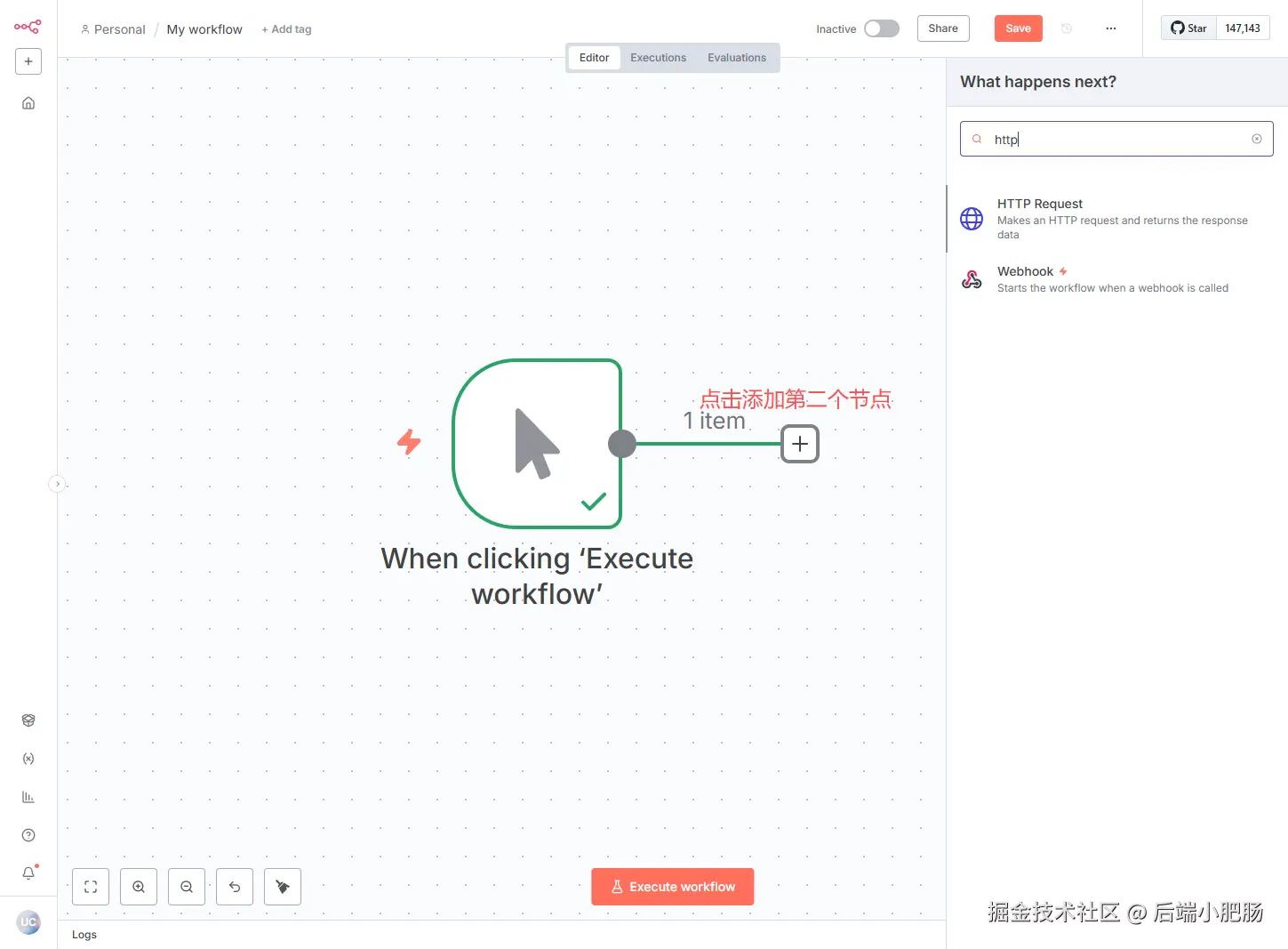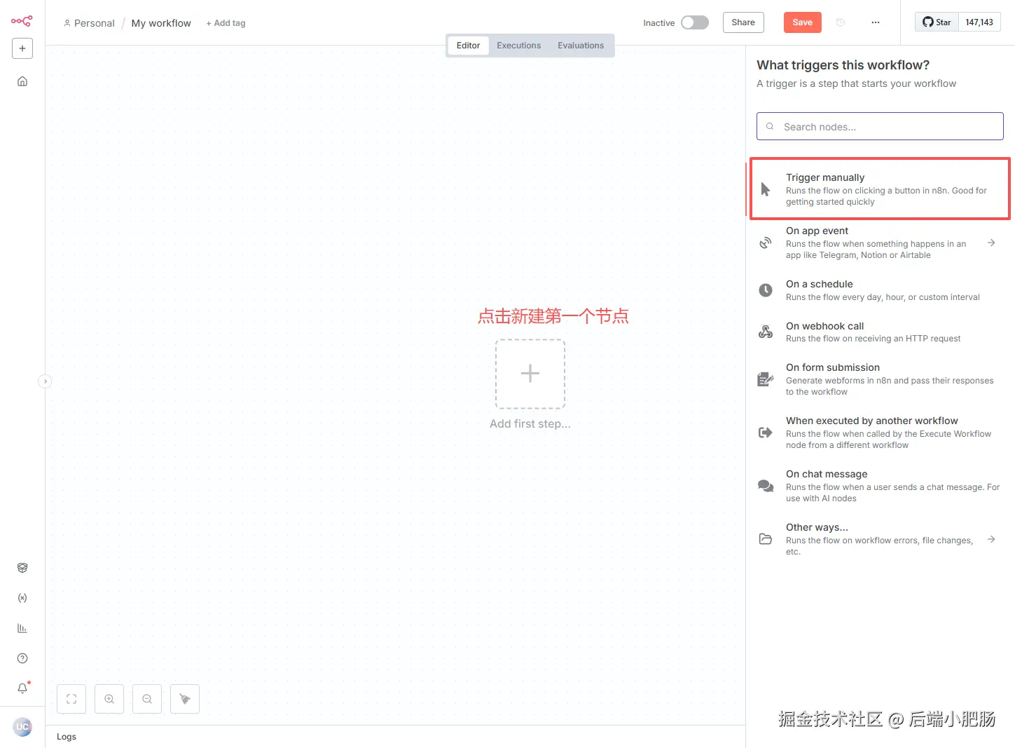 点击页面中心的按钮新建初始节点,选择Trigger manually