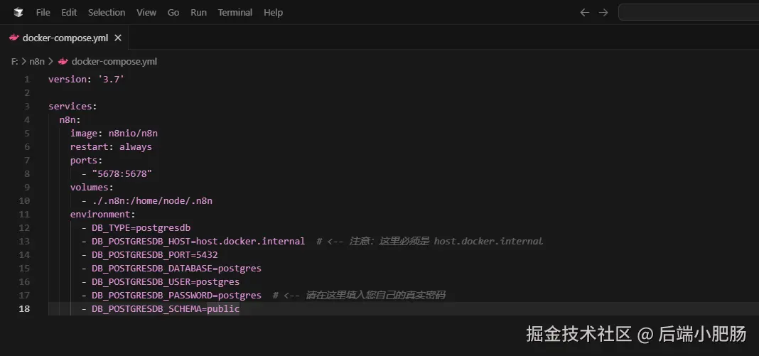 在本地任意磁盘下新建n8n文件夹,用于存放n8n数据,我是放在了F盘下面,新建一个docker-compose.yml文件,内容为: