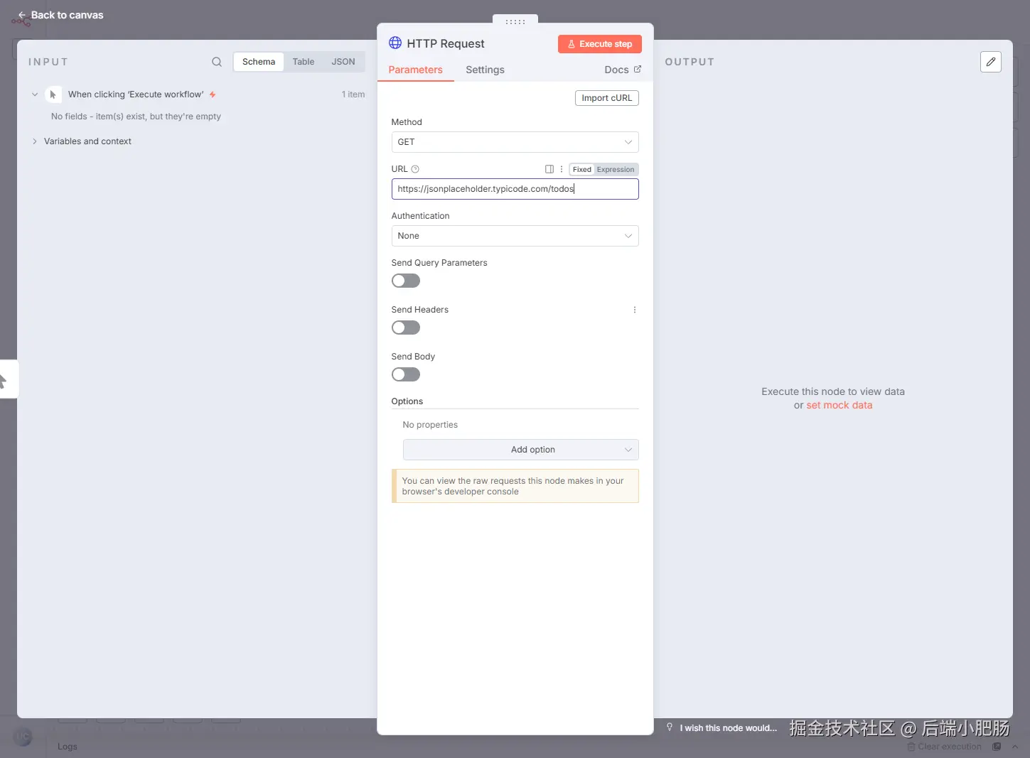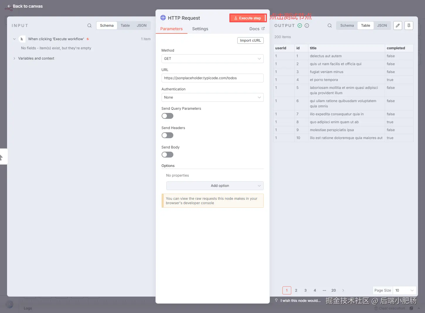 设置HTTP Request节点参数,如下图所示,在URL中填入jsonplaceholder.typicode.com/todos,这个免费测...