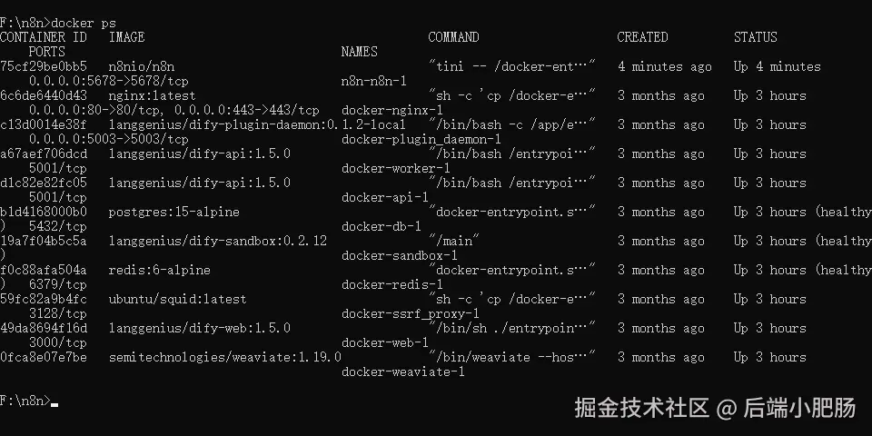 输入命令docker ps查看n8n容器是否启动,有下图可以看出,端口为5678的n8n容器已经成功启动了:
