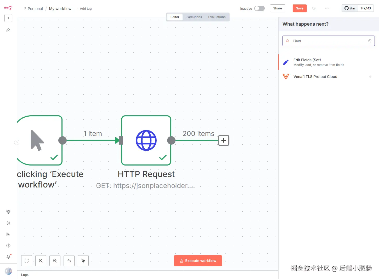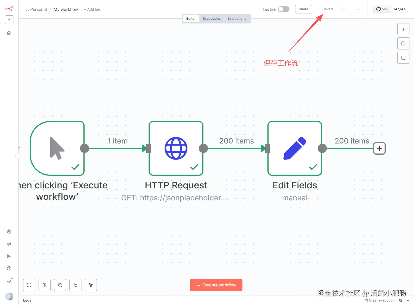 回到工作流界面,点击【Excute workflow】可以运行工作流,点击最后的节点就能查看工作流的运行结果: