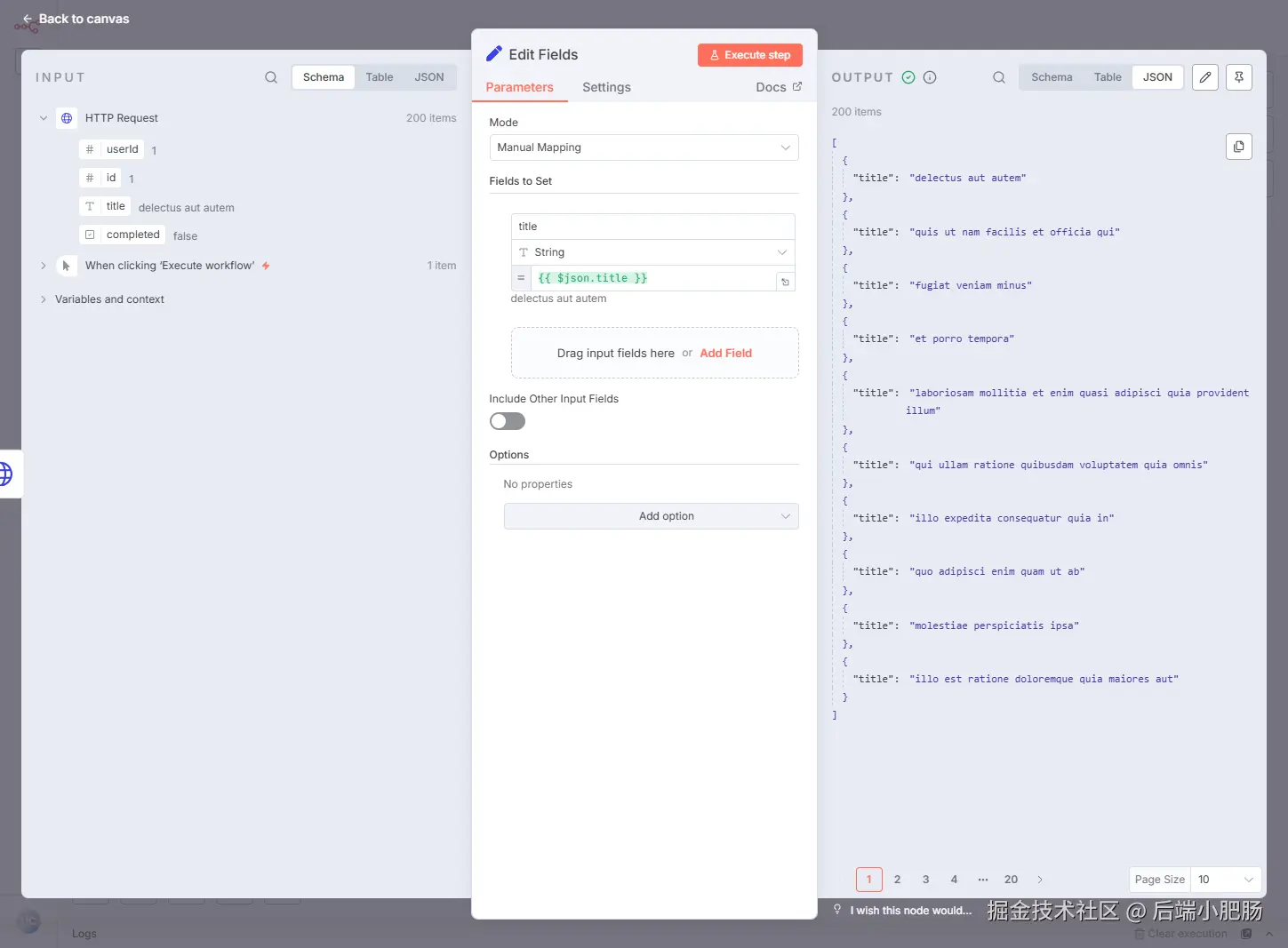 依然可以点击【Excute step】按钮测试单节点运行效果,由下图可知,这个节点把接口返回的数据属性进行了规整,只显示title字段: