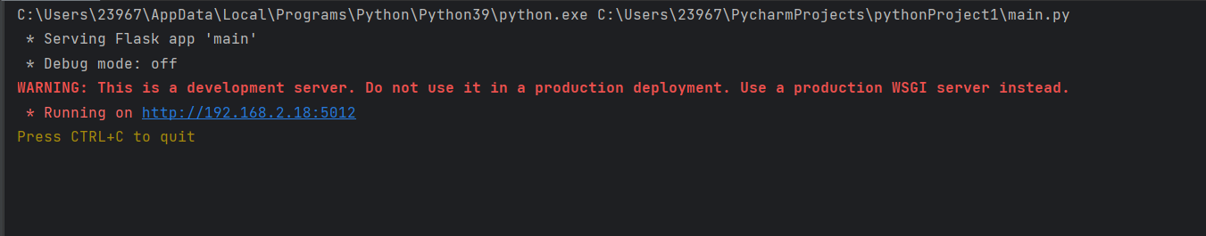 # port=5012:端口号(避免与其他服务冲突,如8080、5000)