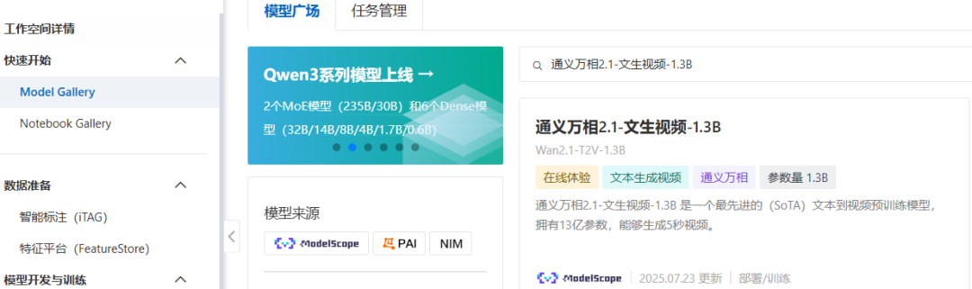在阿里云人工智能业务平台PAI中,查找对应规格的视频生成大模型: