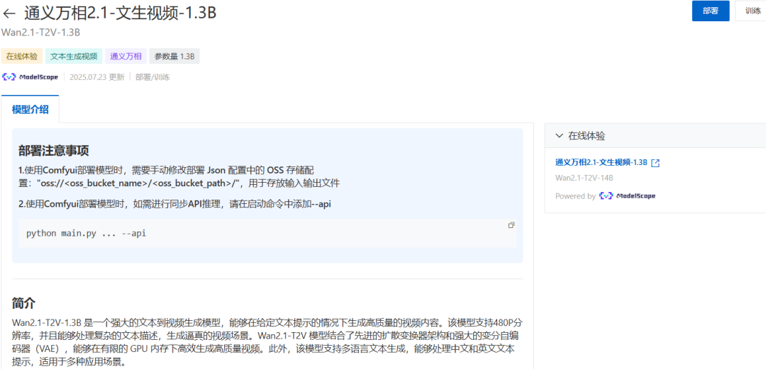 在视频生成大模型的详情页面中,点击部署或者训练按钮,开始设置部署或者训练的属性参数: