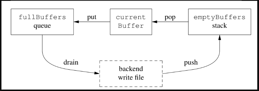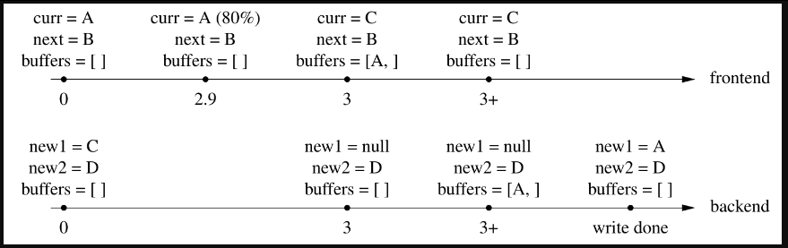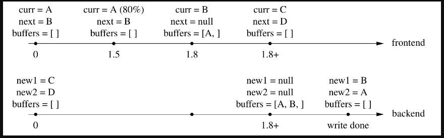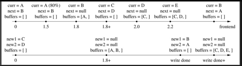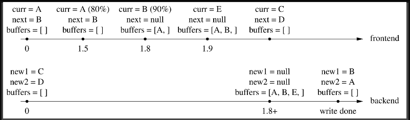 在第1.8秒的时候,缓冲A已经写满,缓冲B也接近写满,并且已经notify()了后端线程,但是出于种种原因,后端线程并没有立刻开始工作。到了第1.9秒,缓冲B也已经写满,前端线程新分配了缓冲E。到了第1.8+秒,后端线程终于获得控制权,将C、D两块缓冲交给前端,并开始将A、B、E依次写入文件。一段时间之后,完成写入操作,用A、B重新填充那两块空闲缓冲。注意这里有意用A和B来填充newBuffer1/2,而释放了缓冲E,这是因为使用A和B不会造成page fault。