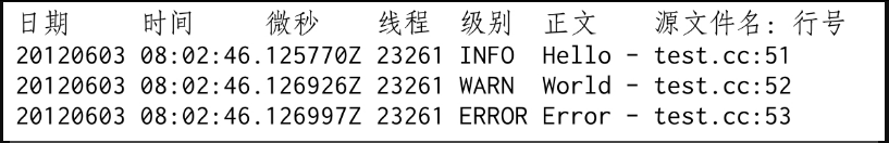 日志消息的格式是固定的,不需要运行时配置,这样可节省每条日志解析格式字符串的开销。我认为日志的格式在项目的整个生命周期几乎不会改变,因为我们经常会为不同目的编写parse日志的脚本,既要解析最近几天的日志文件,也要和几个月之前,甚至一年之前的日志文件的同类数据做对比。如果在此期间日志格式变了,势必会增加很多无谓的工作量。如果真的需要调整消息格式,直接修改代码并重新编译即可。以下是muduo日志库的默认消息格式:
