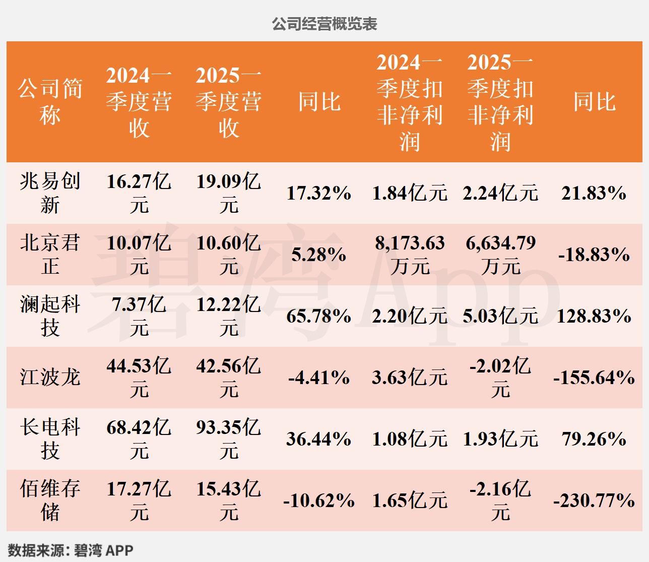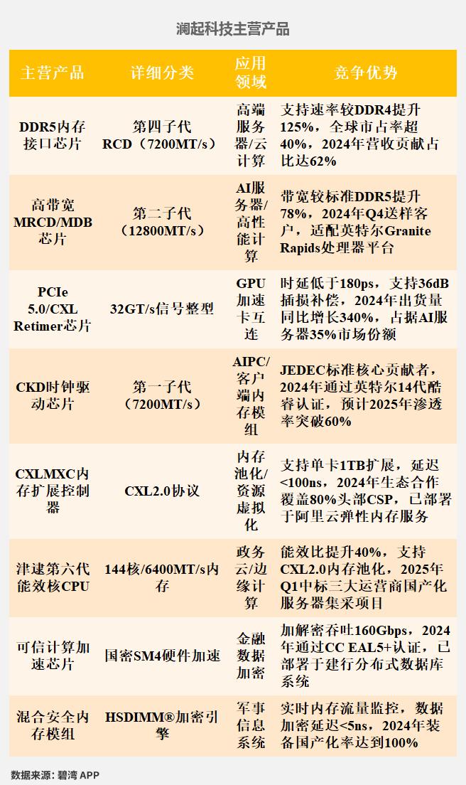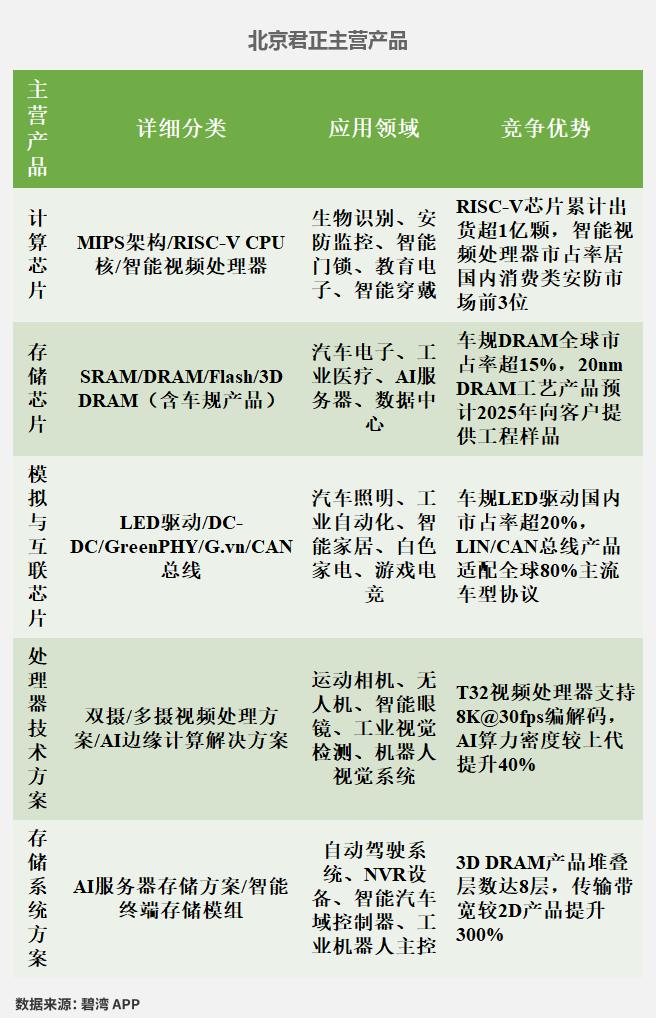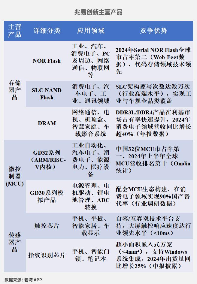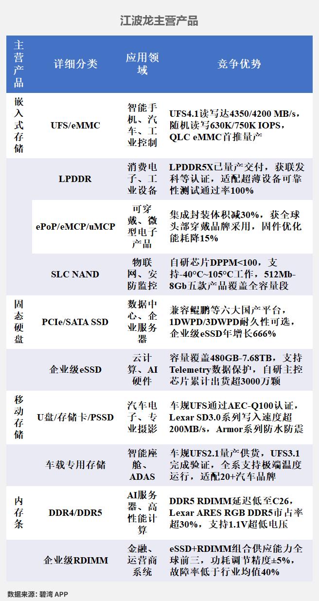 根据兆易创新(603986)、北京君正(300223)、澜起科技(688008)、江波龙(301308)、长电科技(600584)、佰维存储(688525)公开披露数据,对6家公司的主营产品信息等数据统计如下。