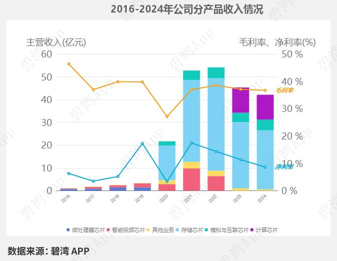 2024年公司的主营业务为集成电路设计,主要产品包括存储芯片和计算芯片两项,其中存储芯片占比61.47%,计算芯片占比25.88%。
