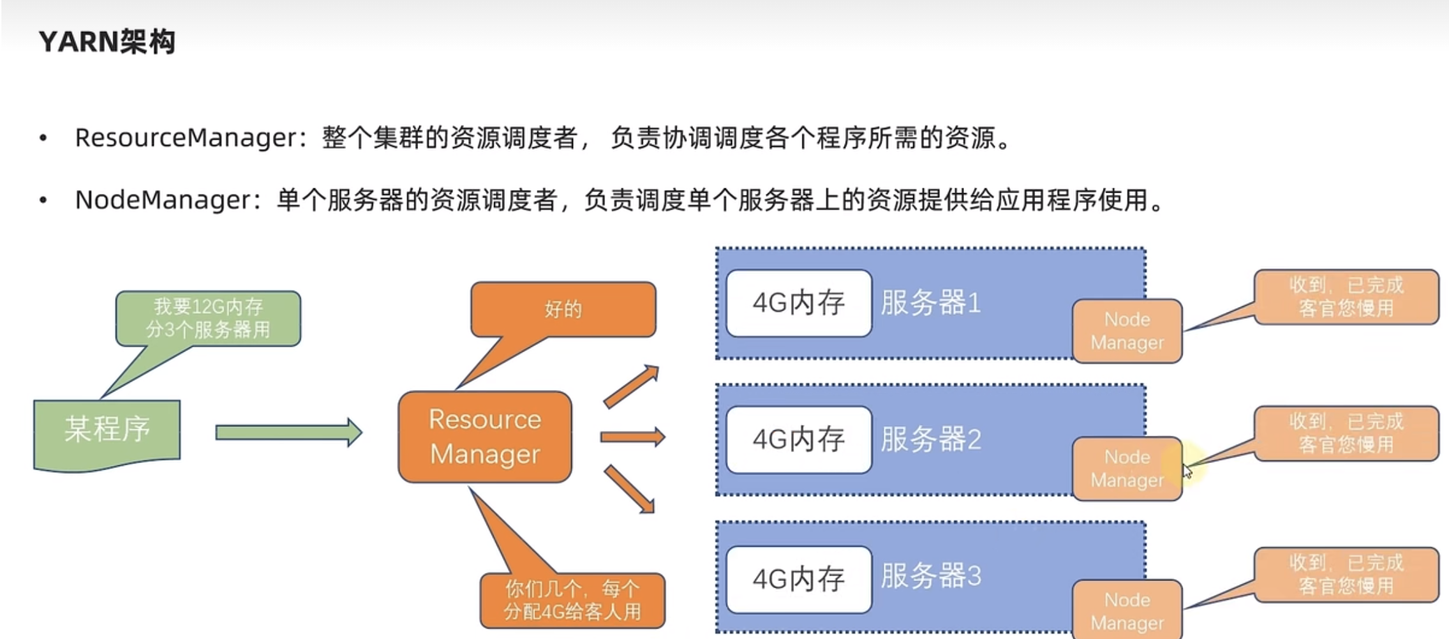 - 管控无序竞争:在分布式集群中,若多个 MapReduce 程序同时运行,会出现 "资源争抢"------ 例如程序 A 占用过多内存,导致程序 B 因内存不足被 "杀死"。YARN 通过 "统一资源池" 机制,将集群所有节点的 CPU、内存整合为 "全局资源池",按任务优先级、资源需求统一分配,避免无序竞争。